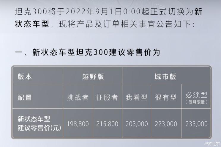 1、自2022年9月1日0:00起,下订的坦克300车型均为新状态车型,升级前车型无法继续购买。