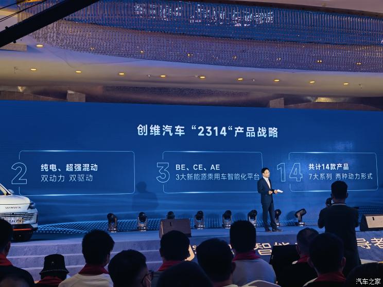 此外,在发布会现场,创维还正式公布了2314战略,“2”代表纯电、混动两种驱动形式,“3”代表BE、CE(2025年首款车型问世)、AE三大新能源乘用车平台,“14”代表将推出14款新产品。同时未来还将实现线控底盘、智能座舱等技术自研,以及创维汽车技术生态等。