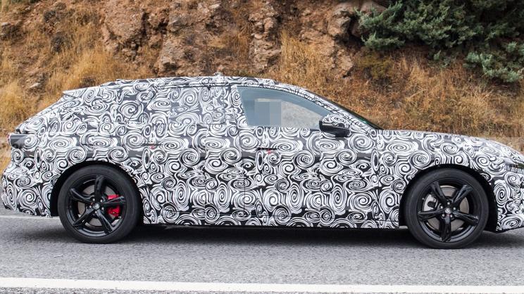 来到车侧,测试车配备了一款亮黑色五辐轮圈,红色卡钳颇为吸睛,车辆的整体侧面线条依旧是我们非常熟悉的样式,略微下滑的车顶+较低的离地间隙让车辆的战斗属性得到充分展现。