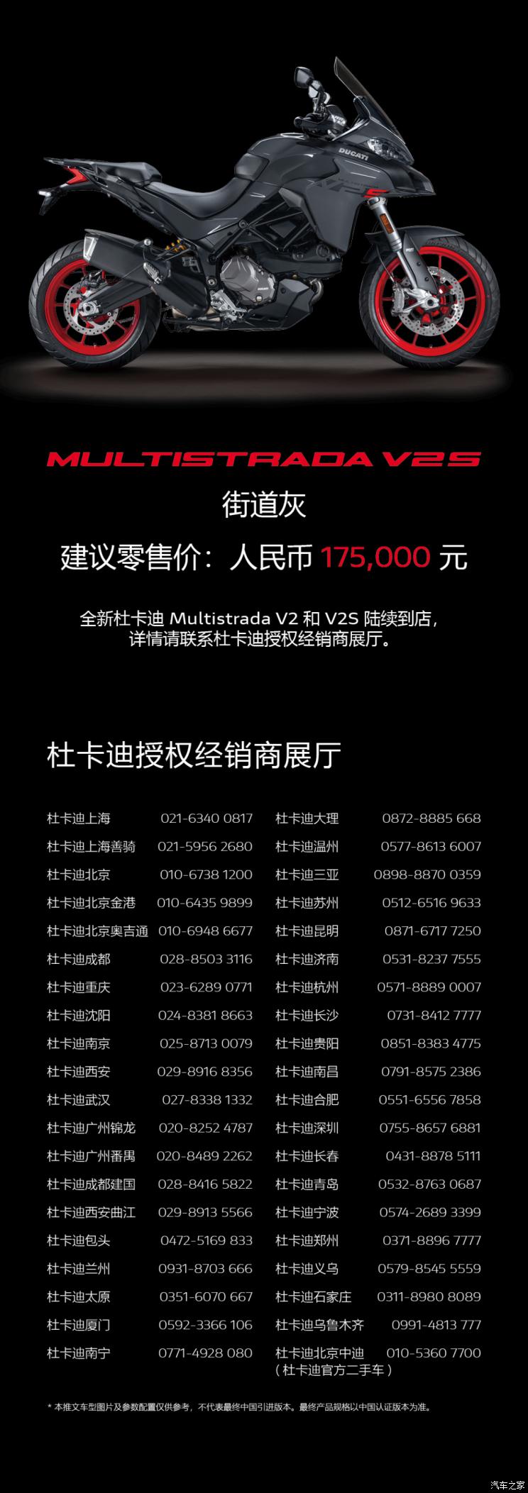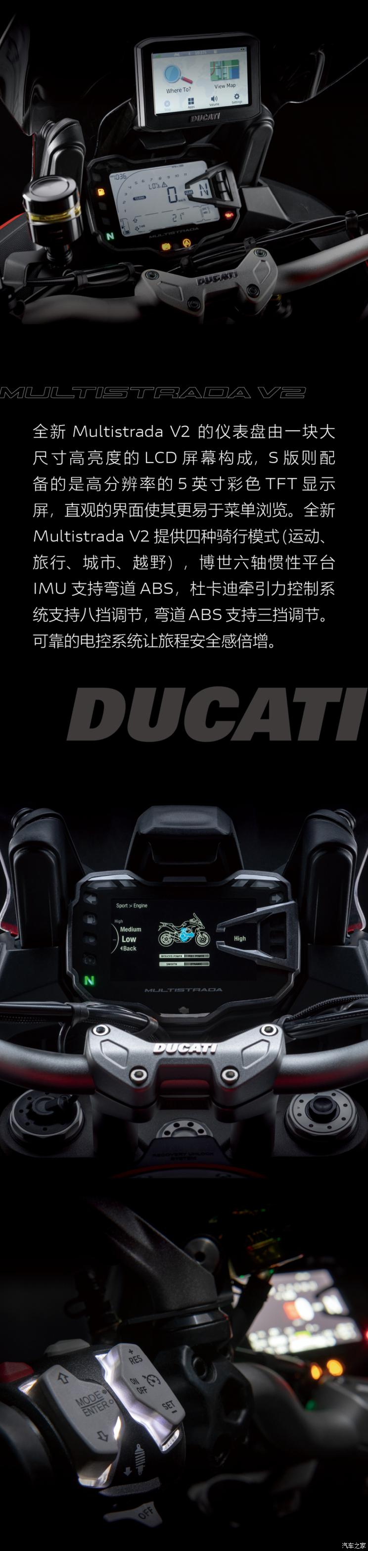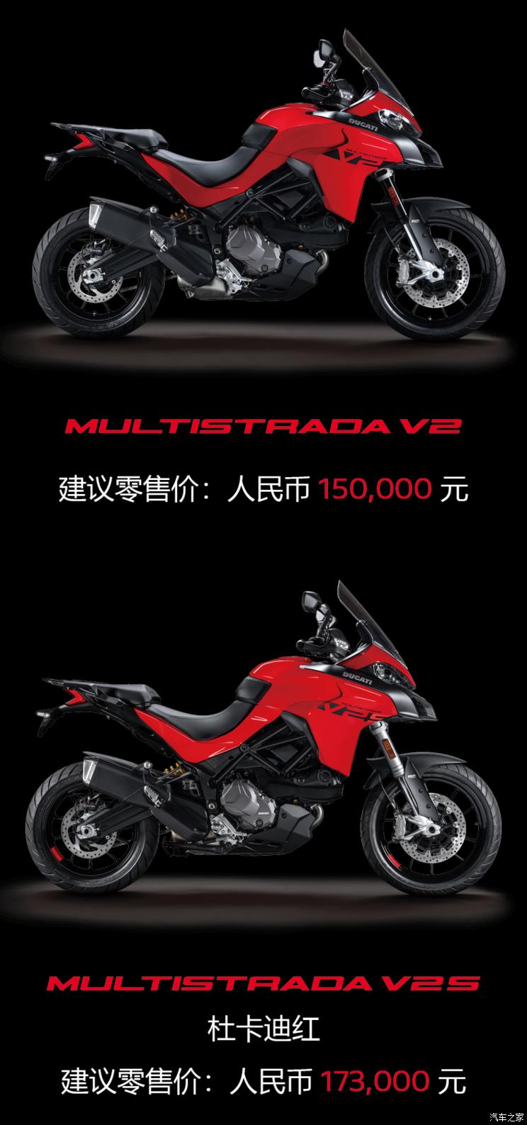 [本站 资讯] 日前我们获悉,杜卡迪Multistrada V2/V2 S车型迎来正式上市,新车共推出三款车型,其中,Multistrada V2的售价为15万元,Multistrada V2 S杜卡迪红的售价为17.3万元,Multistrada V2 S街道灰的售价17.5万元。