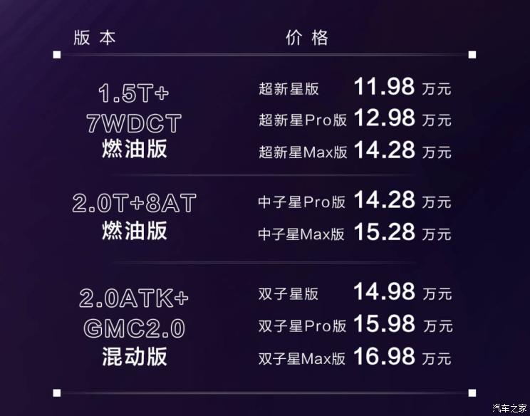 动力方面,新车将提供3种动力组合,其中1.5TGDI发动机最大功率177马力,最大扭矩270牛・米,匹配7速湿式双离合变速箱;2.0TGDI发动机最大功率252马力,最大扭矩400牛・米,匹配爱信8AT变速箱。另外还有2.0ATK阿特金森发动机+GMC 2.0第二代机电耦合系统组成的混动系统,发动机最大功率140马力,最大扭矩180牛・米,有着42.1%的热效率。