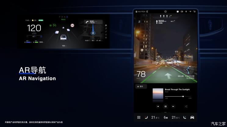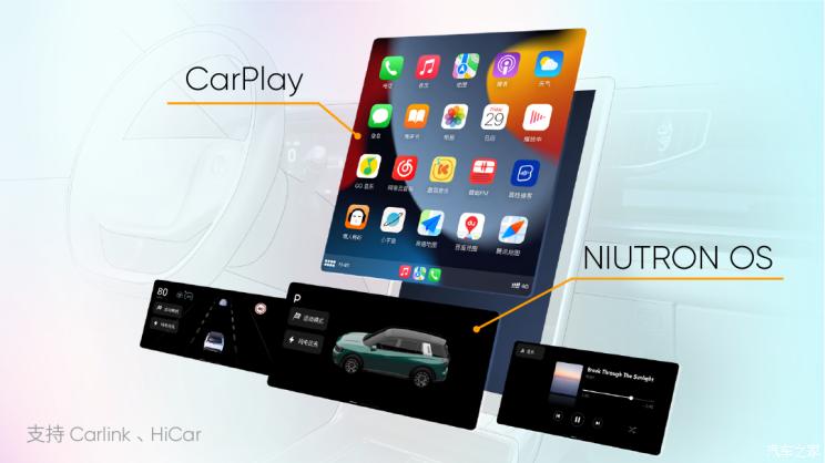当你进入自游家NV时,只需要通过手机或智能穿戴设备即可实现无感解锁,15.6英寸中央悬浮屏使用了基于Android Automotive开发的NIUTRON OS,创新设计Smart Stacks积木拼插交互,支持车机原生系统NIUTRON OS与车载手机应用之间的无缝切换。当用户携带iPhone进入自游家NV时,可无感连接CarPlay。NIUTRON OS和CarPlay均支持将用户常用的导航、音乐、车辆状态等信息在中央悬浮屏与12.3英寸仪表屏进行双屏双显示。此外,车机还支持Carlink和HiCar无线互联,以及AR导航功能。