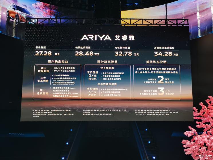 动力和续航方面,Ariya艾睿雅长续航版和长续航顶配版最大总功率为178kW,CLTC续航里程达到623公里;高性能四驱版和高性能四驱顶配版最大总功率为320kW,CLTC续航里程分别为559公里和533公里。