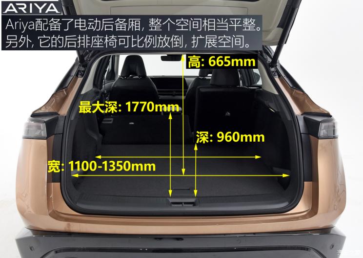 Ariya艾睿雅配备了电动后备厢,整个空间相当平整。另外,它的后排座椅可以比例放倒,进一步扩展空间。