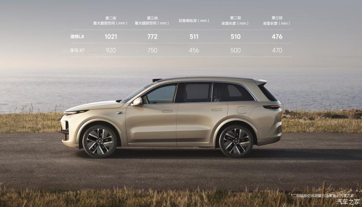既然聊到了车身尺寸,那么一定要插播一条重要信息,理想L8第二排最大腿部空间1021mm,第三排最大腿部空间772mm,中央通道宽度为181mm。作为参考,理想L8的整体空间表现比曾经的理想ONE和宝马旗下的旗舰级SUV X7都更出众。