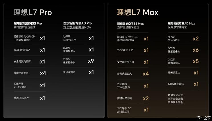 和理想L8所提供的配置类似,理想L7 Pro搭载理想AD Pro智能驾驶辅助系统和智能空间Pro版系统,理想L7 Max则采用了理想AD Max智能驾驶系统和智能空间Max版系统。其中,理想L7 Pro将标配理想AD Pro智能辅助驾驶系统,总算力为128TOPS;理想L7 Max将标配理想AD Max智能辅助驾驶系统。理想AD Max智能辅助驾驶系统所搭载的双英伟达Orin-X算力芯片,能高效地处理高清摄像头、激光雷达、毫米波雷达以及超声波传感器的融合信号,总算力达到508TOPS。您完全可以根据自身需求来选择对应的版本。