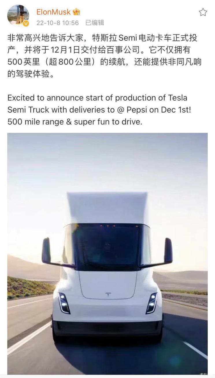 [本站 资讯]日前,马斯克在个人社交媒体上表示,特斯拉Semi电动卡车正式投产,并将于12月1日交付给百事公司。马斯克称,特斯拉Semi不仅可以实现超过800公里的续航,还能提供非同凡响的驾驶体验。