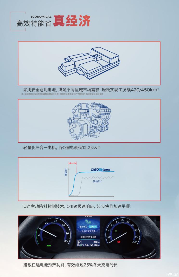 动力方面,新车将搭载一台永磁同步电机,最大功率为120kW,峰值扭矩为250N・m。在电池方面,启辰D60EV PLUS根据配置不同提供磷酸铁锂电池组和三元锂电池组,其续航里程分别为420km和450km。同时启辰D60EV PLUS对电控系统进行优化,可实现最高29%能量回收效率。关于新车更多信息,我们也将持续关注。