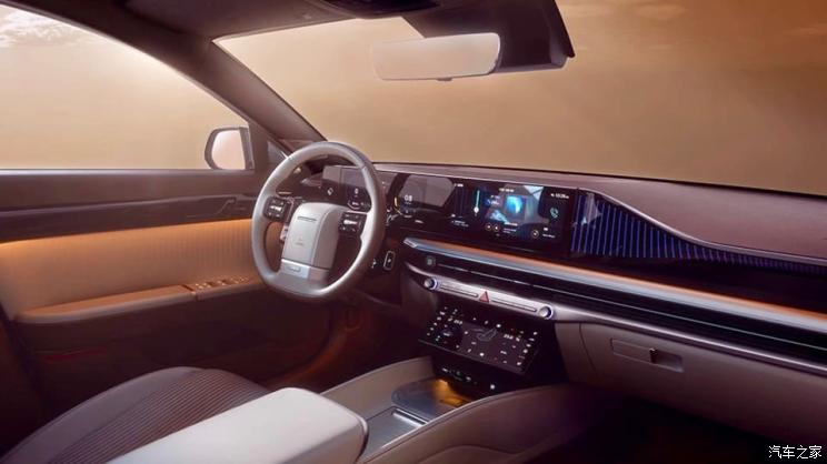 车身侧面旨在营造旗舰车型所应有的豪华感和动感风格,隐藏B柱和隐藏式门把手的设计使得车侧看起来颇有高级感,又与简约优雅的整体风格相契合。而C/D柱的设计则是在向初代雅尊车型致敬,更具有辨识度。尾部来看,“地平线”贯穿式尾灯与车头相呼应,微微上翘的鸭尾式设计与线条锋利的后包围搭配共同塑造出车尾丰富的层次感。