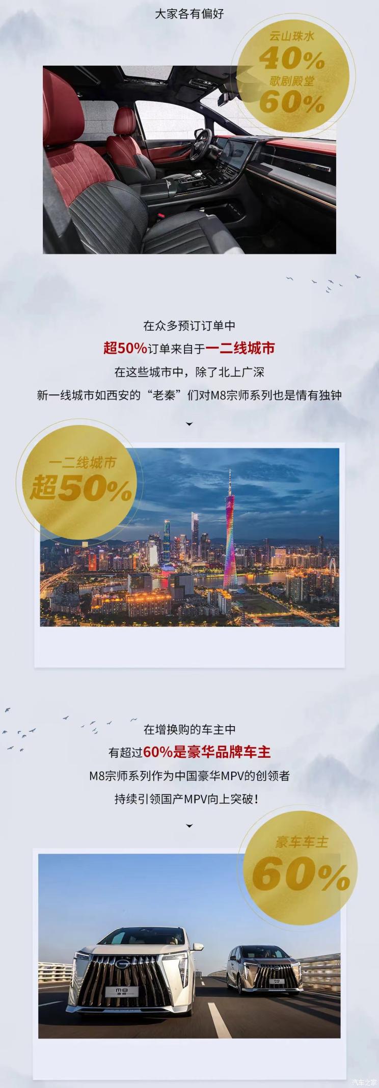据悉,订购传祺M8宗师系列的用户中,有45%选择了双擎御尊版(顶配版本),另外燃油旗舰版车型也有超过20%的用户选择。颜色方面,将近五成用户选择了刃影白色,另有10%用户选择全新的殿藏金色。云山珠水与歌剧殿堂两种内饰占比4:6。超过50%订单来自于一二线城市,增换购车主中,有60%是豪华品牌车主,另外85后是绝对主力。