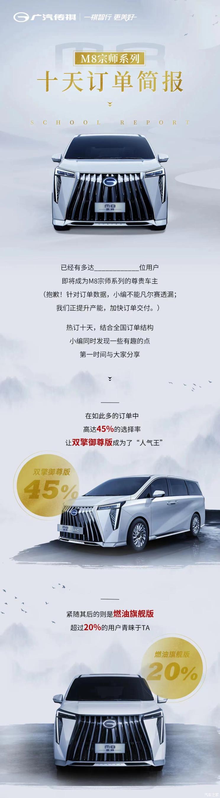 [本站 资讯] 日前,广汽传祺官方公布了传祺M8宗师系列的订单简报,同时表示新车有望很快正式上市。该车于10月18日正式开启预售,共推出5款配置车型,预售价区间为27.50-34.50万。用户可通过官方唯一预订通道(广汽传祺App)线上预订M8宗师系列车型。上市后将根据下订顺序进行排产与交付,预订通道开启前已在销售店下订用户无需App重复下订。
