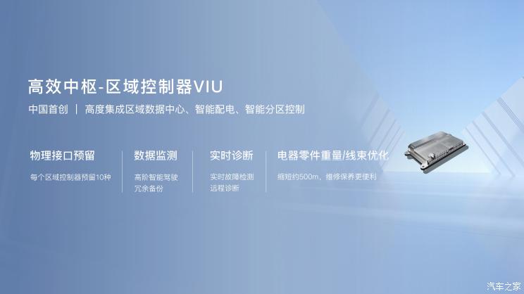 SOA电子电气架构将整车功能整合成前、后、左、右4个VIU控制器,并由OIB统一支配,核心系统及芯片通过组合方式物理集成,集中算力到中央大脑,处理效率更高。VIU控制器按功能布局,减少了线束的排布,提升了数据调配的效率与准确性。同时,VIU统一外部设备接口标准,实现硬件可扩展,为用户呈现出一个犹如智能手机般的硬件架构,并拥有不断进化的能力。