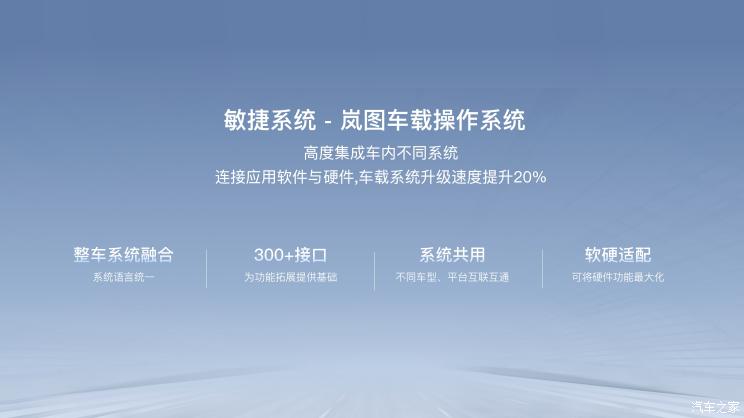 岚图车载操作系统是车辆的底层神经网络,高度集成车内不同系统,链接应用软件与硬件,软硬适配,整车系统语言统一,最大化释放软硬件性能,车载系统升级速度提升20%;预留了300+接口,可开发90%以上的应用程序,提升后期用车机生态体验。其中,系统融合应用广:将传统分布式软件系统(包括自动驾驶系统、车辆控制系统、智能座舱系统等)统一整合,系统语言统一,不同系统和软件之间信息畅通无阻,拓展产生更多功能应用;软件设备拓展能力强:300+信号接口、车控服务接口200+、应用服务接口50+、生态服务接口50+,未来将达到600+接口,为车辆软硬件扩展提供基础,软件迭代速度提升20%;共享系统应用多:系统共用,适用于不同车型、不同平台,实现不同车辆的互联互通,实现更多功能全平台共享,由单一车型生态变为全平台全系列生态,增加应用数量和迭代速度。