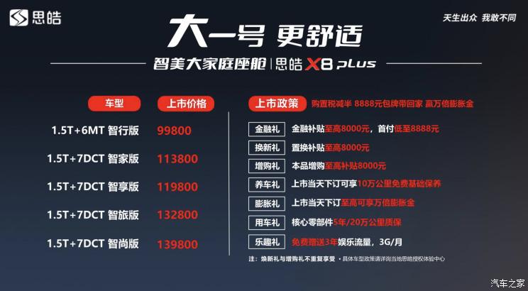 [本站 新车上市] 11月20日,思皓X8 PLUS车型正式上市。新车共推出5款配置车型,售价区间为9.98-13.98万元。值得一提的是,新车将拥有6座版与7座版可选,并且配备了丰富的智能驾驶辅助系统。