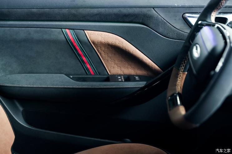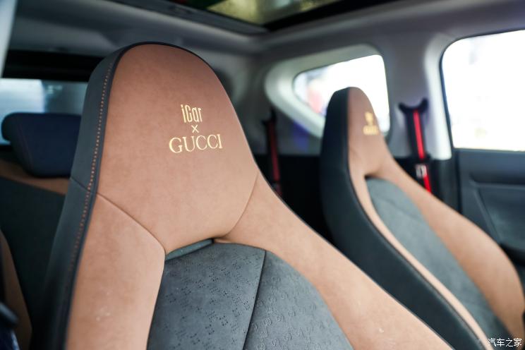 可以看到,该车内饰大量采用了GUCCI品牌的设计元素,细节来看,新车在方向盘上拥有GUCCI经典的小蜜蜂图案,此外在车辆的中控也印着iCar GUCCI品牌的联名设计。不仅如此,在车辆的门把手处也采用了GUCCI品牌经典的配色。座椅设计也十分用心,座椅采用了印着GUCCI品牌LOGO的翻毛皮座椅。