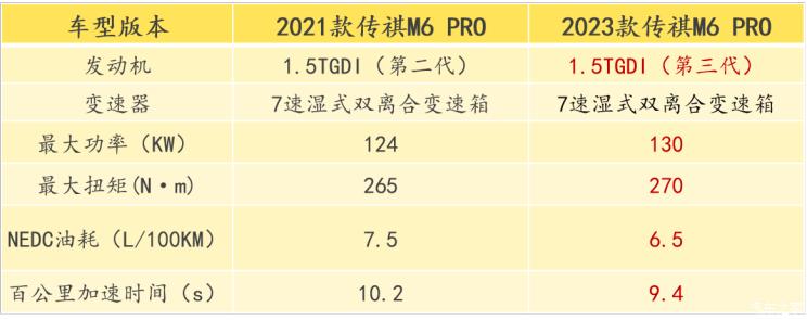动力方面,新车搭载全新第三代1.5TGDI发动机,最大输出功率提升为177马力(130kW),峰值扭矩提升至270牛・米,传动系统匹配7速湿式双离合变速箱。官方透露,在新动力总成的加持下,新车0-100km/h加速将从10.2s缩减至9.4s,NEDC油耗相比2021款传祺M6 PRO的7.5L/100km缩减至6.5L/100km。
