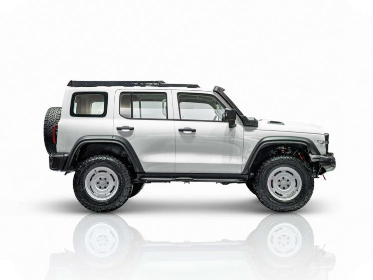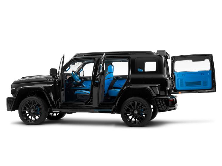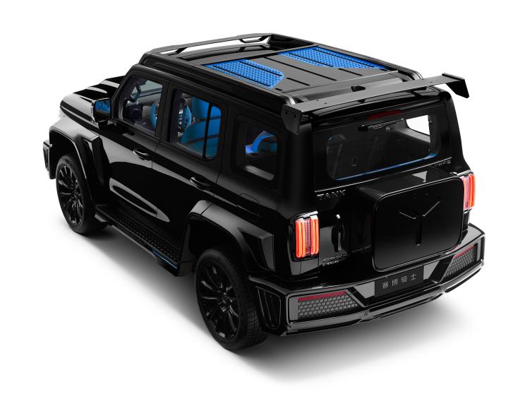 车身侧面来看,新车增加了宽体轮眉以及密条辐大尺寸轮圈,让整车看上去更具气场。另外,全黑的车身颜色彰显出了一些神秘气息。车尾部分,新车配备了一个碳纤维材质的车顶扰流板,后备厢门外配备了外挂式的备胎罩,两侧尾灯组依旧纵向布局的矩阵式设计,尾灯外壳配以熏黑样式,为车身进行了点缀。新车后包围造型也更加犀利,扩散器造型进一步凸显了新车的运动气息。