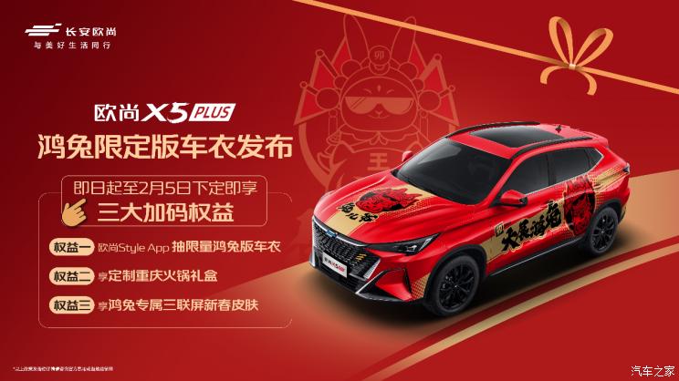 [本站 新车官图] 1月11日,我们从长安欧尚官方获取到了旗下紧凑型SUV――欧尚X5 PLUS鸿兔限定版官图。据官方表示,其联动TMD车膜推出该限定版车衣。同时,官方还发布3大加码权益,包括:欧尚Style App抽限量鸿兔版车衣,享定制重庆火锅礼盒(以上两大权益即日起至2月5日下定、2月28日24点前提车,即可兑现),享鸿兔专属三联屏新春皮肤(即日起至2月5日欧尚X5 PLUS全系用户均可体验)。