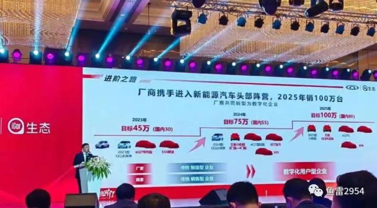 [本站 资讯]日前,网络上曝光出一组2023-2025年奇瑞新能源新产品规划图。其中,2023年,奇瑞新能源计划的销量目标为45万台,国内销量30万台。2023年重点新车包括2023款QQ冰淇淋、代号S56的硬派纯电SUV和eQ7纯电版。