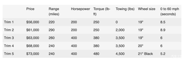从曝光的信息来看,新车有5个配置,最低配车型的续航里程为220英里,次低配车型的续航增加至290英里,这意味着它可能拥有更大的电池。到了售价6.3万美元的中配车型上,则可以拥有四驱,总输出功率为400马力和515牛米,续航里程为260英里。至于售价7.3万美元的旗舰版,其拥有653牛米的扭矩;外观方面则有21英寸的黑色轮圈。当然,以上信息来自起亚发给意向用户的调查问卷,最终新车是否会采取这样的配置还要到上市时揭晓。