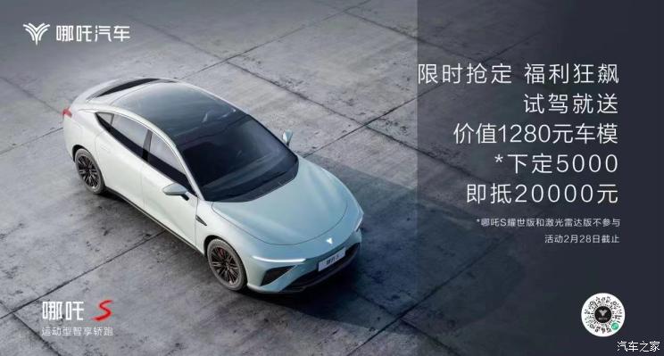 [本站 资讯] 日前,我们从官方获悉,哪吒汽车发起了“春雷行动”,为哪吒S量身打造了限时用户权益,在2月28日前,试驾就送价值1280元车模,下定5000元即抵20000元(哪吒S耀世版和激光雷达版不参与)。