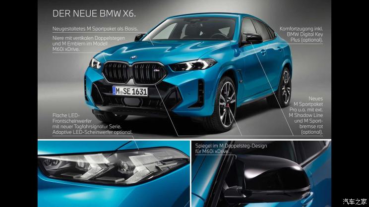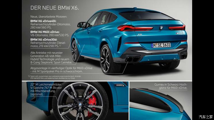 [本站 新车官图] 2月8日,我们从官方获取到了旗下中大型SUV――新款宝马X6车型官图。作为改款车型,其针对外观造型、内饰进行全面升级,整体看上去更加时尚、年轻。