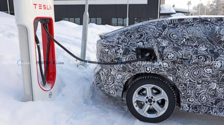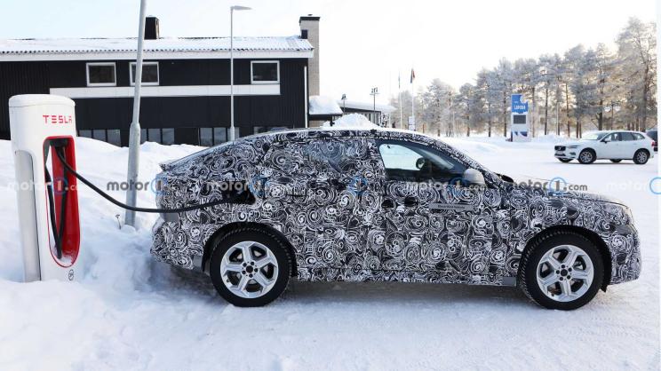 车身侧面来看,该车采用了溜背式造型设计,其个性化属性进一步增强,这也与宝马X4、X6系列组成了完整的轿跑SUV家族。此外,新车还采用了大尺寸的五辐式Y形轮圈。同时,该测试车正在使用特斯拉充电桩为其充电,也进一步证实这是一款电动车。