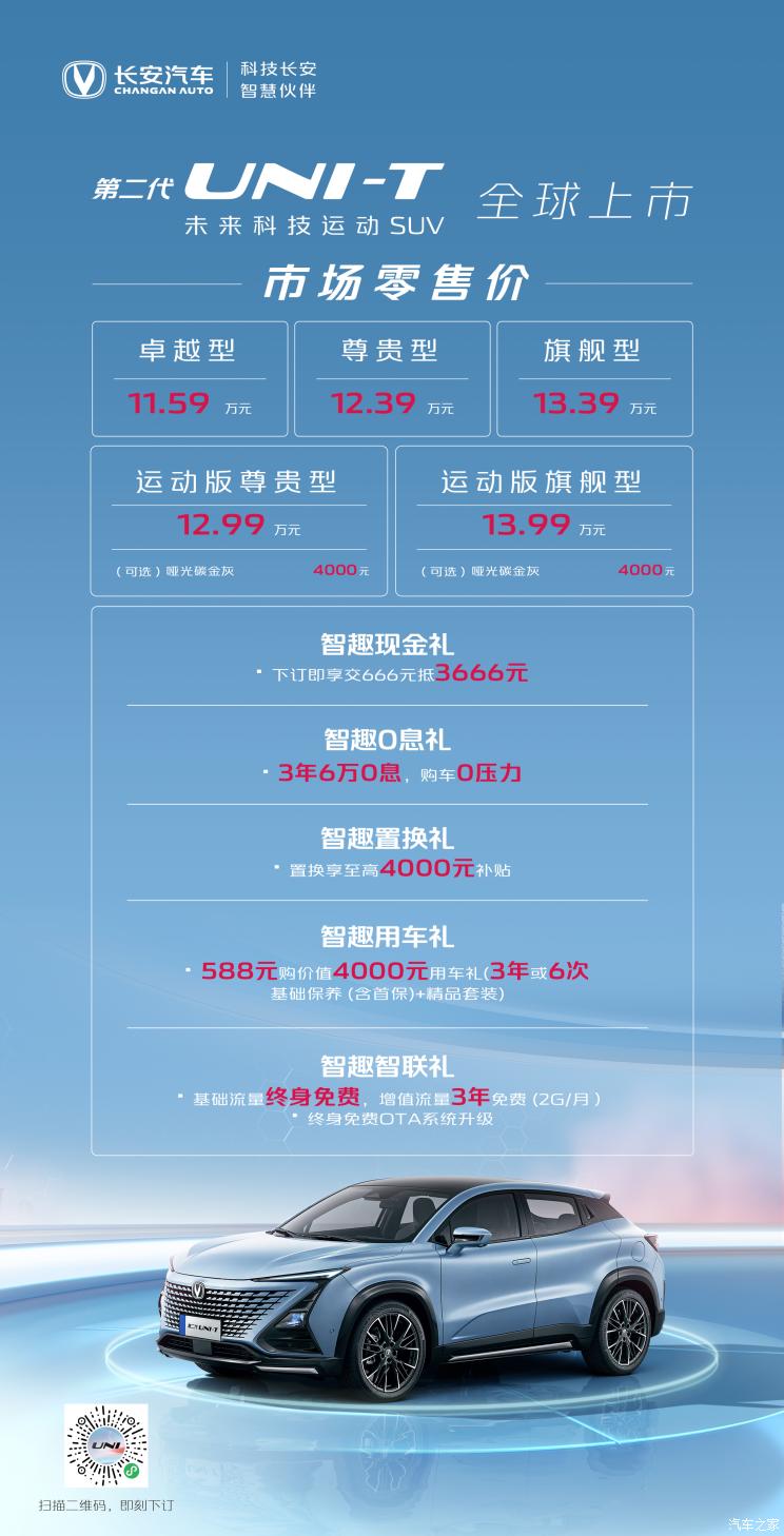 [本站 新车上市]2月17日,新款长安UNI-T上市,新车共计推出5款车型,售价区间为11.59-13.99万元。新车定位为紧凑型SUV,此次推出的为改款车型,主要在内饰上有较大提升,并取消了之前的2.0T动力。购车福利方面,新车3年6万0息,置换享至高4000元补贴,下订666元抵3666元。
