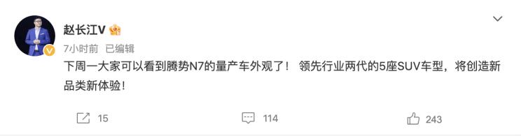 [本站 资讯]3月4日,腾势销售事业部总经理赵长江在社交媒体上宣布,腾势N7的量产外观造型将于3月6日公布,同时他表示领先行业两代的腾势N7将创造新品类新体验。