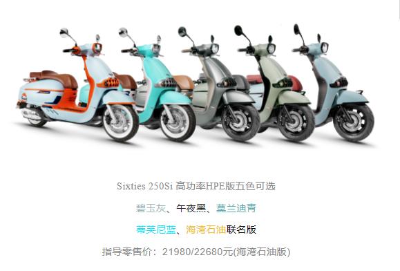 维多利亚Sixties 250Si 高功率HPE版搭载源自意大利科技动力的NEXUS 250S HPE高功率单缸SOHC四气门水冷发动机,最大功率达到18kW/8750rpm,最大扭矩22.2N・m/6750rpm,搭配CVT无级变速。新车分为五个颜色,其中比较有特色的是海湾石油联名版,售价比普通版本贵700元。