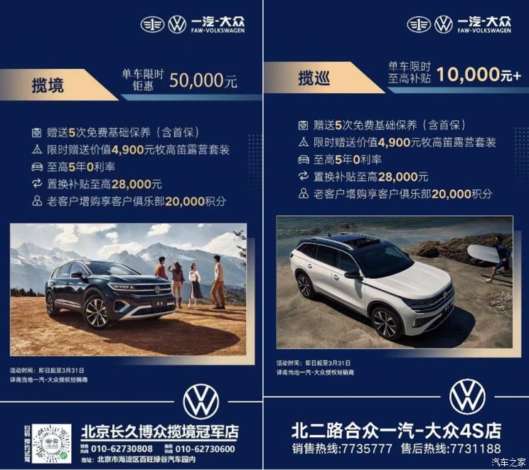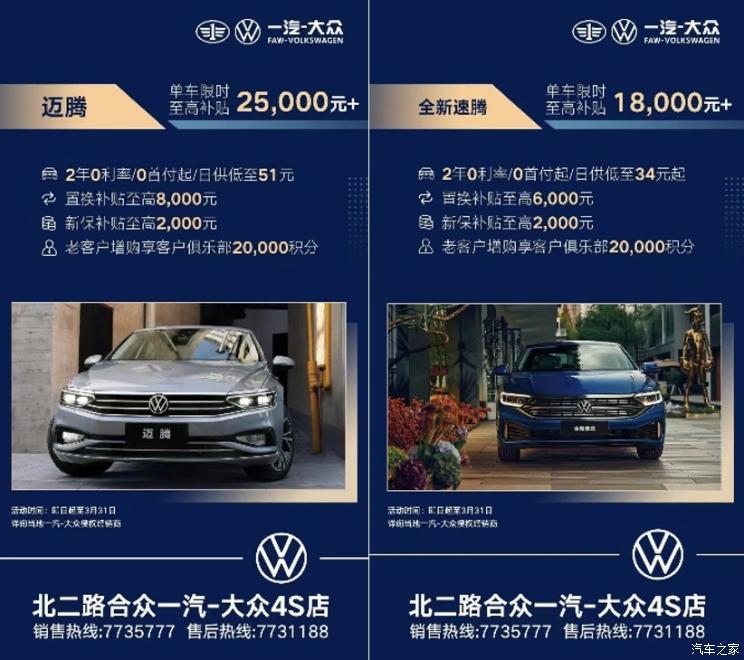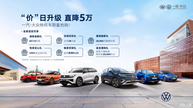 [本站 资讯]日前,一汽-大众终端发布全系优惠补贴,不过,与其他品牌不同的是,此次一汽-大众并没有给出官方的统一优惠价格,而是终端经销门店限时优惠补贴的措施,此次优惠截止时间至3月31日,详情还请咨询经销商。