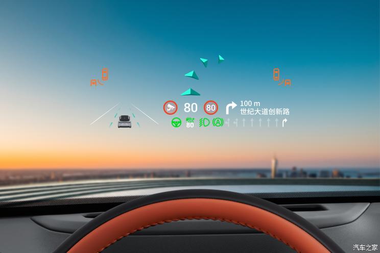 首先,新车配备了AR-HUD全息式增强现实系统,通过与智能驾驶、车载系统深度融合,将主驾前方视野聚焦到上方,提升安全性;该系统的成像视距为7.5米,成像尺寸为53英寸。并可以分别以2D、3D等形式来显示不同信息。
