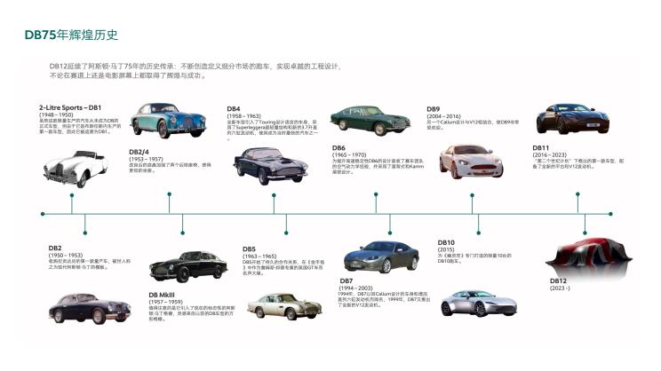 阿斯顿・马丁DB系列已经拥有75年的历史,其中最被车迷们津津乐道的无疑是阿斯顿・马丁DB5,它不仅在007系列电影中大放异彩,同时也被誉为是最美DB车型。此外,作为阿斯顿・马丁敲开中国市场大门的代表作,DB9车型于2007年首次引入到国内市场,直到10年后由DB11继承了它的衣钵。