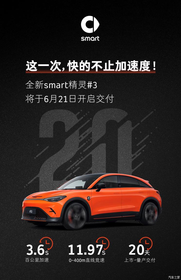 [本站 资讯] 6月15日,我们从官方渠道获悉,全新smart精灵#3将于6月21日开启首批交付。smart精灵#3是smart纯电动车家族的第二款车型,于6月1日率先在国内上市,并实现了上市当月即交付的承诺。
