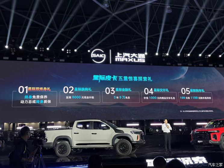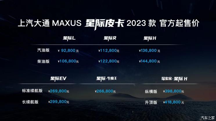 [本站 新车上市] 7月3日,上汽大通发布全新皮卡品牌“星际”,对以往的T系列皮卡进行重新梳理,旗下星际L、星际R、星际H和星际EV正式上市。其中星际L汽油版9.28万元起售、柴油版10.68万元起售;星际R汽油版11.28万元起售、柴油版12.28万元起售;星际H汽油版13.68万元起售、柴油版14.48万元起售;星际EV标准续航版26.98万元起售、长续航版29.98万元起售。另外,星际・牛魔王起售价为26.68万元;探索家・星际H推出2款车型,起售价分别为39.88万元和41.88万元。