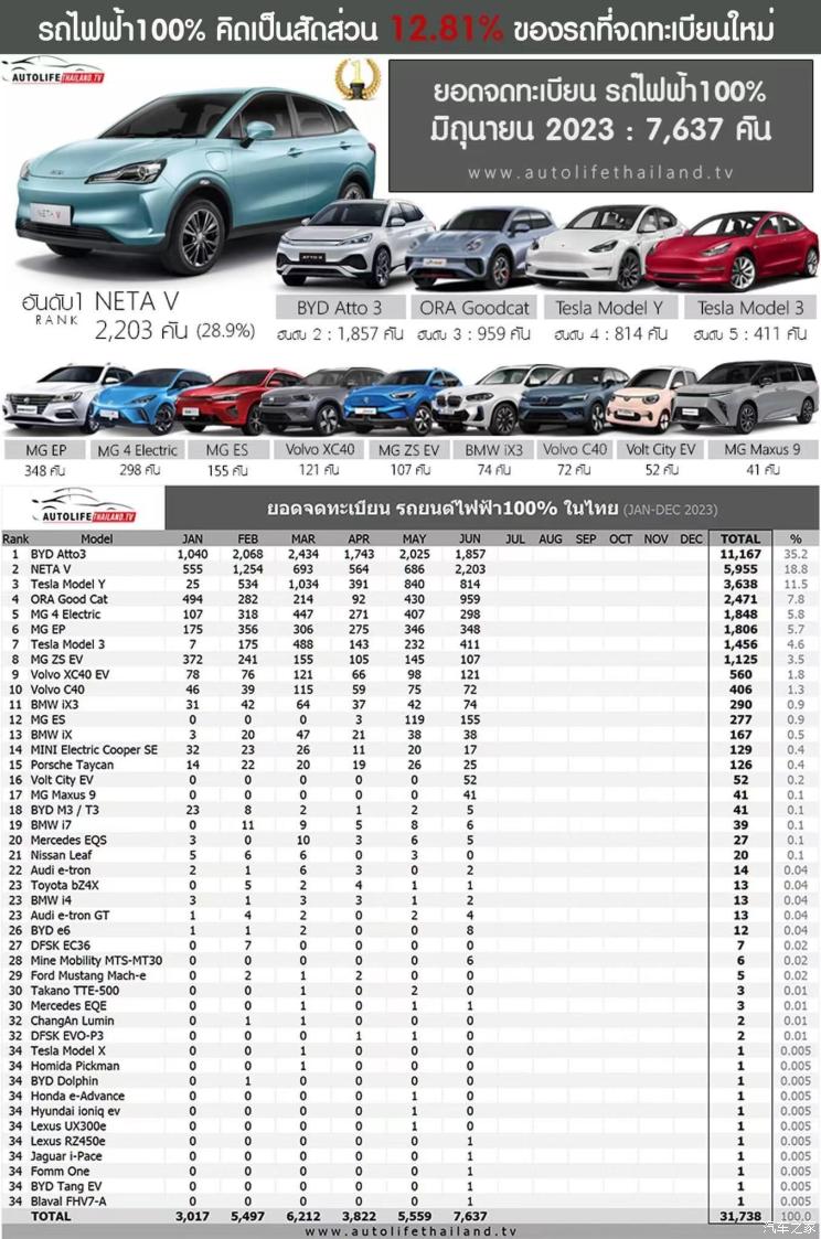 7月,泰国AutoLife官网公布2023年6月泰国纯电车型上牌量数据。其中,哪吒V上牌量达到2,203辆,以28.9%的市占率一举超越多个品牌产品,登顶泰国市场纯电冠军。