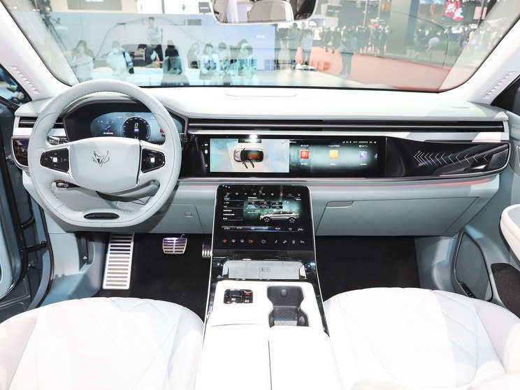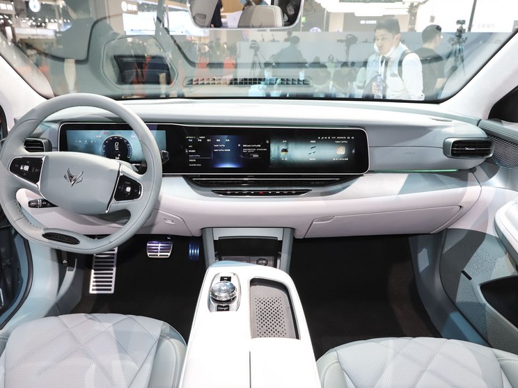 内饰方面,新车采用环抱式驾舱设计,中控台以平直线条为主,功能分区清晰、合理。配置方面,搭载了由20.3英寸中控屏、10.1英寸触控屏、12.3英寸液晶仪表和8英寸风挡HUD组成的四屏互联系统,同时具有人脸识别、手势控制、语音交互等技术。