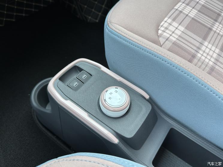 内饰整体比较简洁,车内仅有一个全液晶仪表盘,中控区域没有屏幕,车内的色彩明快,方向盘包含功能控制按键。变速器排挡采用旋钮式设计。油门制动踏板有“+”和“-”的符号,方便新手驾驶员驾驶。此外,车内中控台还提供了丰富的储物空间。