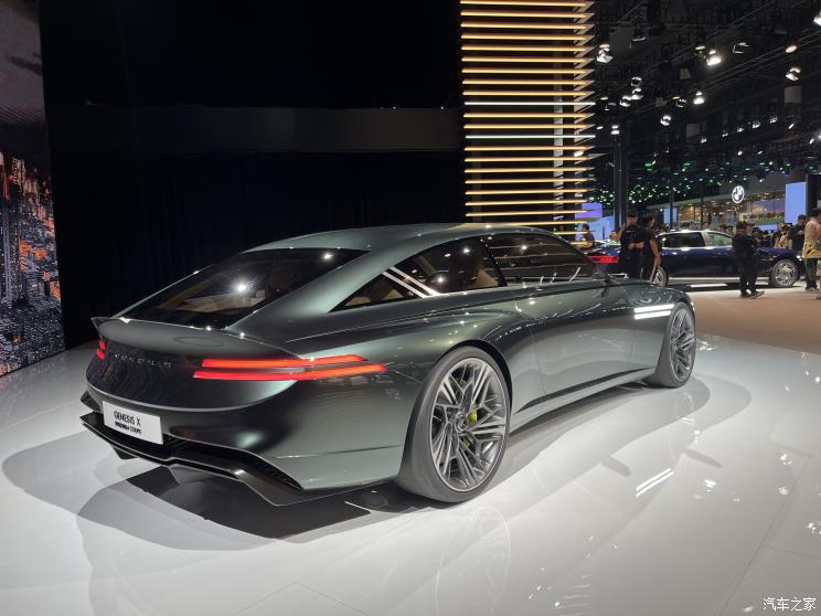 车尾部,新车也采用了双条幅的尾灯组设计,后备厢采用了圆弧的轮廓造型,形成了一个类似鸭尾的扰流板设计,并在其上内嵌了贯穿式的LED灯组。捷尼赛思X Speedium Coupe概念车的翡翠绿金属漆被命名为“仁济绿”。