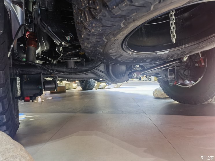 车身侧面来看,它的车身尺寸为5435x1935x1872mm,轴距3270mm。外扩的轮眉上还带有铆钉的设计效果。其还采用了规格为285/70 R17的百路驰KO2轮胎,并且搭配红色的运动卡钳及K-MAN油气分离式外置氮气减震器。减震器的总行程为前210mm和后220mm,根据不同路况,驾驶员还可通过旋钮对压缩阻尼进行自定义调节(8挡阻尼可调)