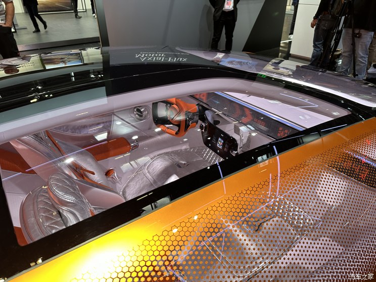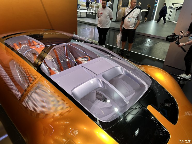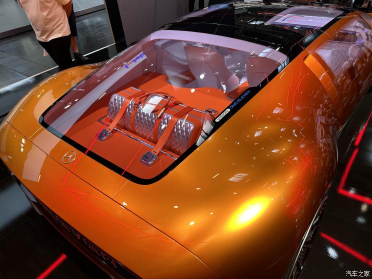 其以弓形车身作为主导设计元素,仅为1170毫米的车高勾勒出动感的低风阻轮廓。独特古铜色调的深橙色涂装,致敬了C 111标志性的车漆颜色。前脸两侧低矮的圆角矩形元素同样是向C 111致敬,对应C 111雾灯的部分则采用充满科技感的3D像素风格显示屏,将C 111经典的圆形雾灯设计进行了数字化的全新演绎;屏幕同时也具备与其他交通参与者沟通的功能。