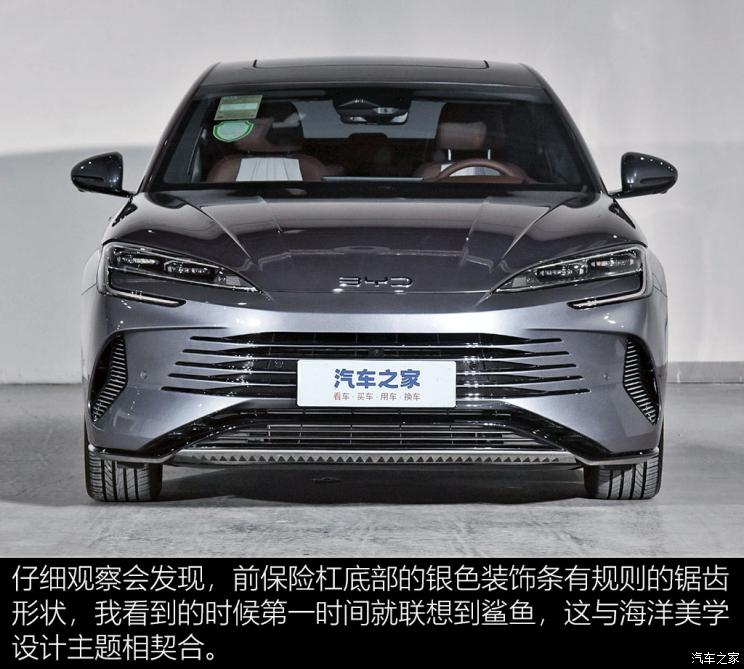 外观方面,海豹DM-i在海洋美学的高度上,带来了更创新的设计,更是从水滴、涟漪、海浪中汲取设计灵感,密幅式格栅造型配合两侧带有拐角的LED灯组再加上前包围两侧造型犀利的散热开口,整体呈现出了非常动感的造型样式。