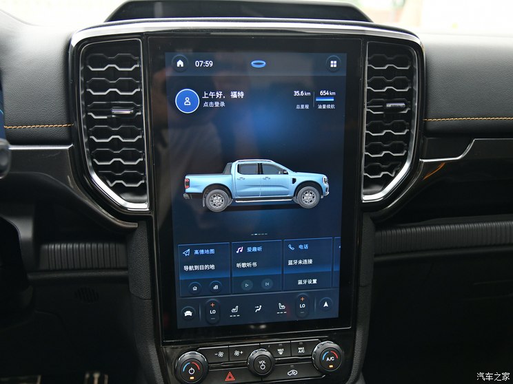 内饰方面,江铃福特Ranger中控台有大量的皮质软包,并通过橘色的装饰进行修饰。中控台除了传统的手套箱外,上部还提供了一个储物箱,并还有一个可伸缩的杯架。方向盘上的按键经过了本地化的改造,可以看到方向盘加热、微信等按键。新车还配备了全液晶仪表盘,显示状态展现出美系车的味道,并可以看到胎压监测。