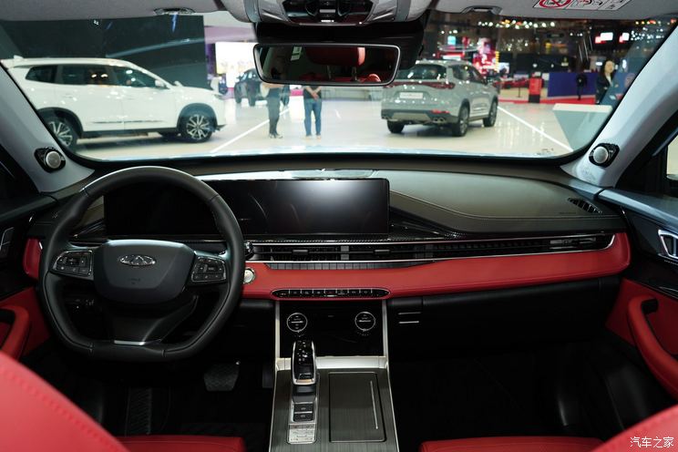 新车的内饰也基本延续了老款瑞虎7 PLUS的造型,内饰整体设计看上去十分简约,横向贯穿式空调出风口提升了车内视觉宽度。新车采用了三辐式多功能方向盘和电子换挡杆。全液晶仪表盘与中控多媒体显示屏的双联屏组合,进一步提升了车内的科技感。