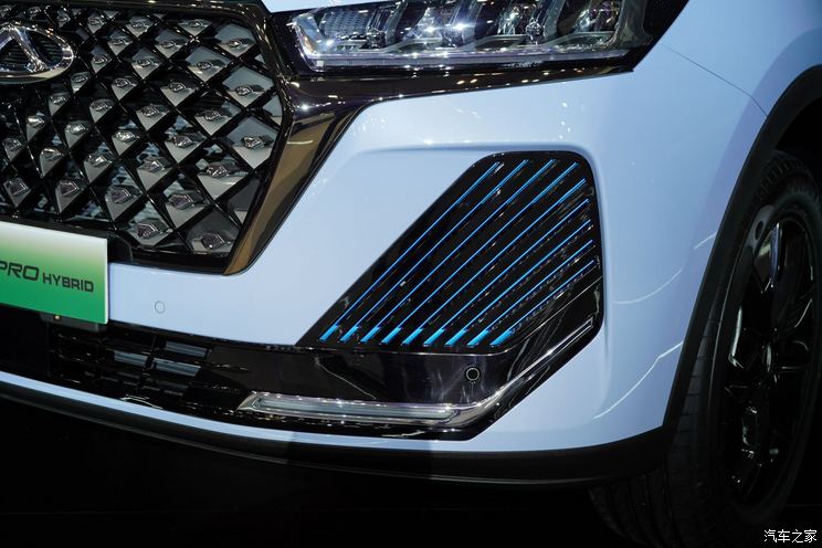 外观来看,奇瑞瑞虎7 PRO PHEV基本延续了老款瑞虎7 PLUS的外观设计,整体造型显得非常大气。大嘴式多边形前进气格栅与两侧狭长的大灯组相连,增强了前脸的时尚感。中网内部采用网状格栅,带来较强的时尚感。前包围两侧采用了全新设计的造型,蓝色的斜向纹理看起来十分动感。