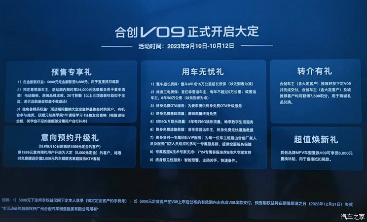 合创V09定位为中大型纯电动MPV,此前已开启预订,共推出5款车型,预售价格为32万-46万,预定活动将持续至10月12日,最终新车将于10月13日正式上市。此外,参与预定的车主还将享受多种权益,如定金膨胀、整车超长质保、终身免费道路救援和置换补贴等。