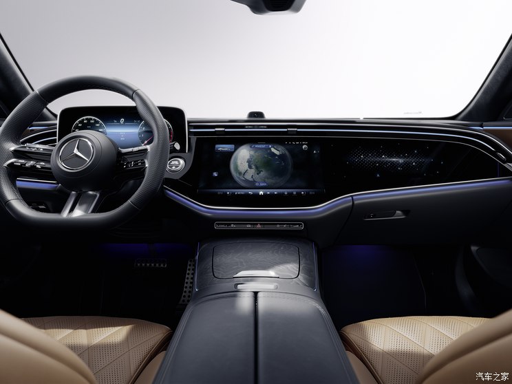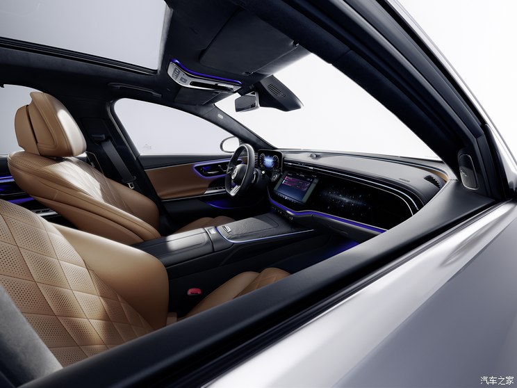 新车的内饰采用了大尺寸三联屏设计以及类似“蜻蜓”设计的三辐式方向盘,搭载第三代MBUX智能人机交互系统应用了新开发的兼容层,搭载了更多第三方车载应用,实现更丰富的内容生态,如:刷抖音、玩游戏,或是利用车内摄像头进入视频会议等 。同时,全新E级车支持数字汽车钥匙,车主可以仅使用智能手机开启或关闭车辆。