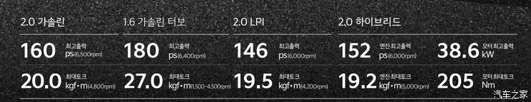 动力系统方面,这款车在韩国会提供2.0L自然吸气发动机(160马力)、1.6T发动机(180马力)、2.0LPI液化石油气发动机(146马力)以及2.0L混动动力(发动机152马力,电机38.6kW)。