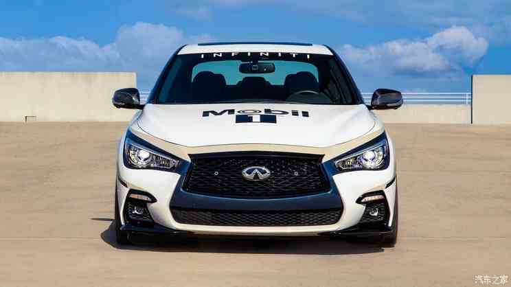 外观来看,该车采用了赛车风格涂装,发动机舱盖上印有赞助商美孚1号的标志,挡风玻璃上印有INFINITI字样,黄黑白三色的搭配十分有辨识度。下包围处配备了空气动力学套件,配合犀利的大灯设计使整个车头看起来更加凶狠。