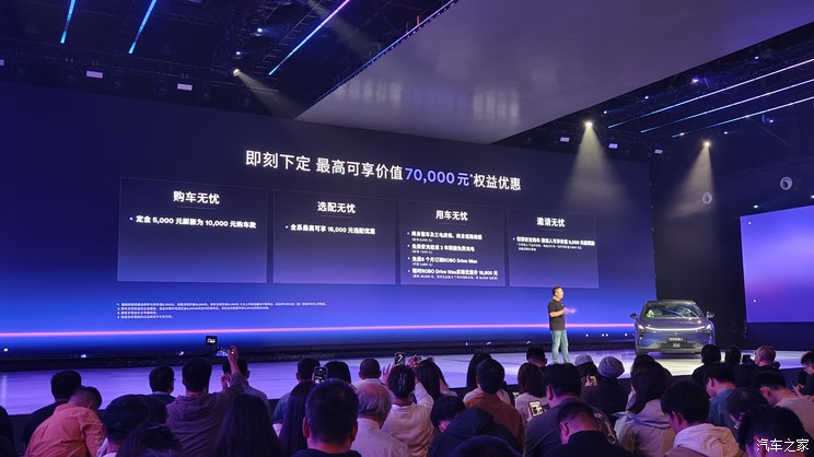 权益方面,即刻下定,最高可享价值70000元的权益优惠,包括定金5000元膨胀为10000元购车款;全系最高可享15000元选配优惠;终身整车及三电质保、终身道路救援(价值8000元);免费家充桩或2年限额免费充电(价值7500元)、免费6个月订阅ROBO Drive Max(价值5880元)、限时ROBO Drive Max买断优惠价19900元、引荐好友购车,邀请人可享价值5000元起奖励。